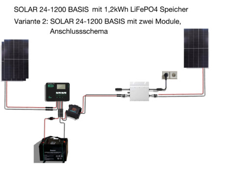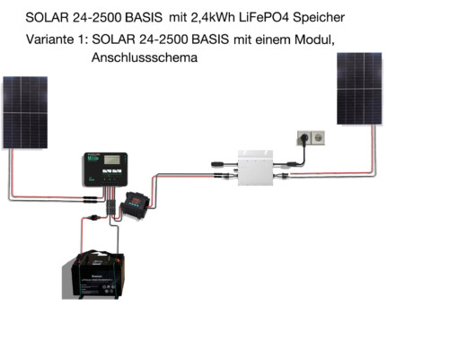 SOLAR 24-2500 BASIS BOOST ist ein Speicher Nachrüstpaket. Es kann sich mit bestehender Anlage (1-4 Module auf Hoymiles HM300-400, HM600-800, HM1000-1500, und Deye SUN300, 600, 800 Microwechselrichter) integrieren. SOLAR 24-2500 BASIS BOOST kann selbst mit bis zu 3 Module (2 Module in Reihe-Schaltung, oder 3 Module in Parallel) anschließen, dadurch kann am Sonnenschwachen Tage mehr Strom gewinnen. Wie beigefügte Anschlussschema.